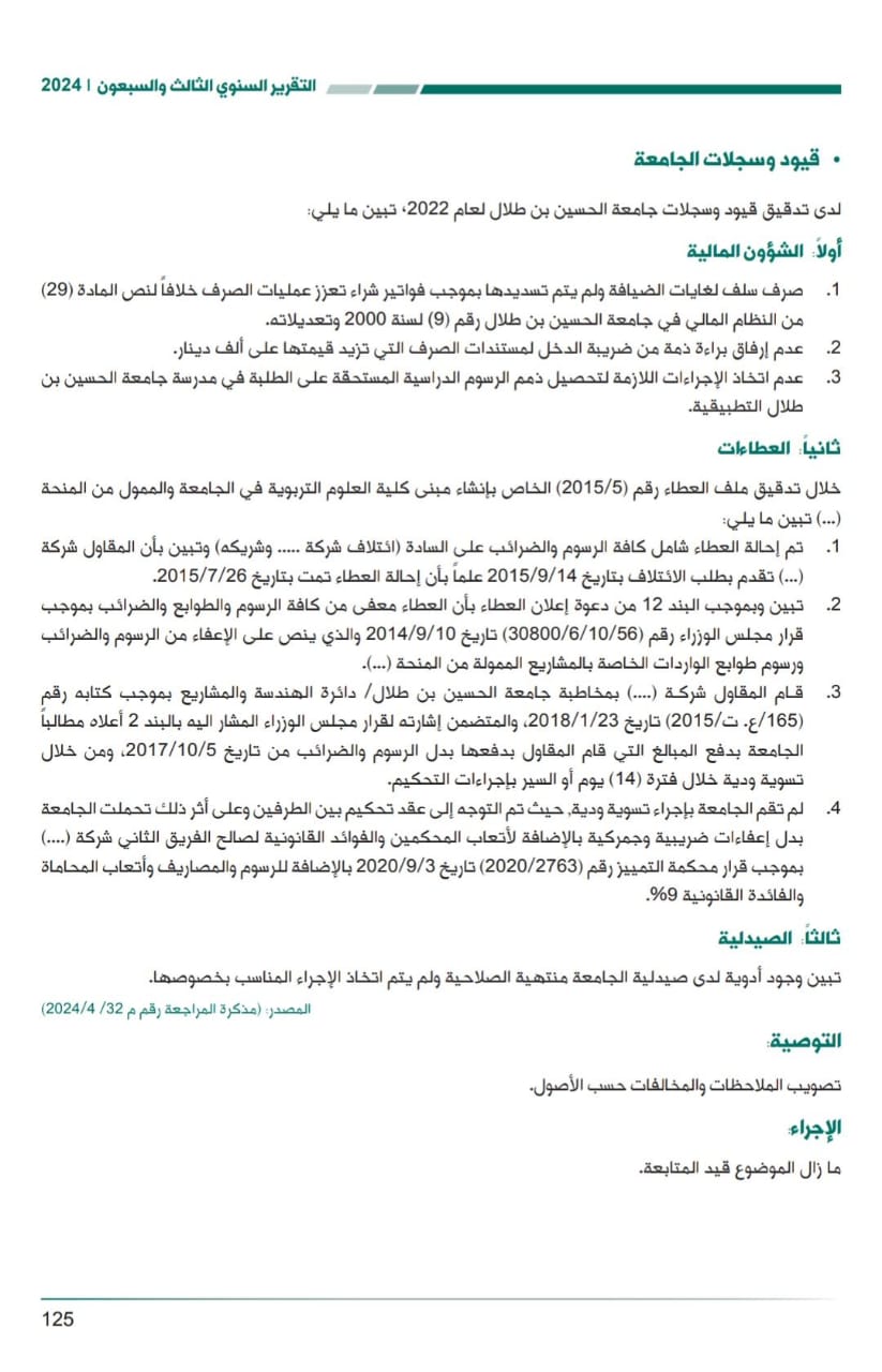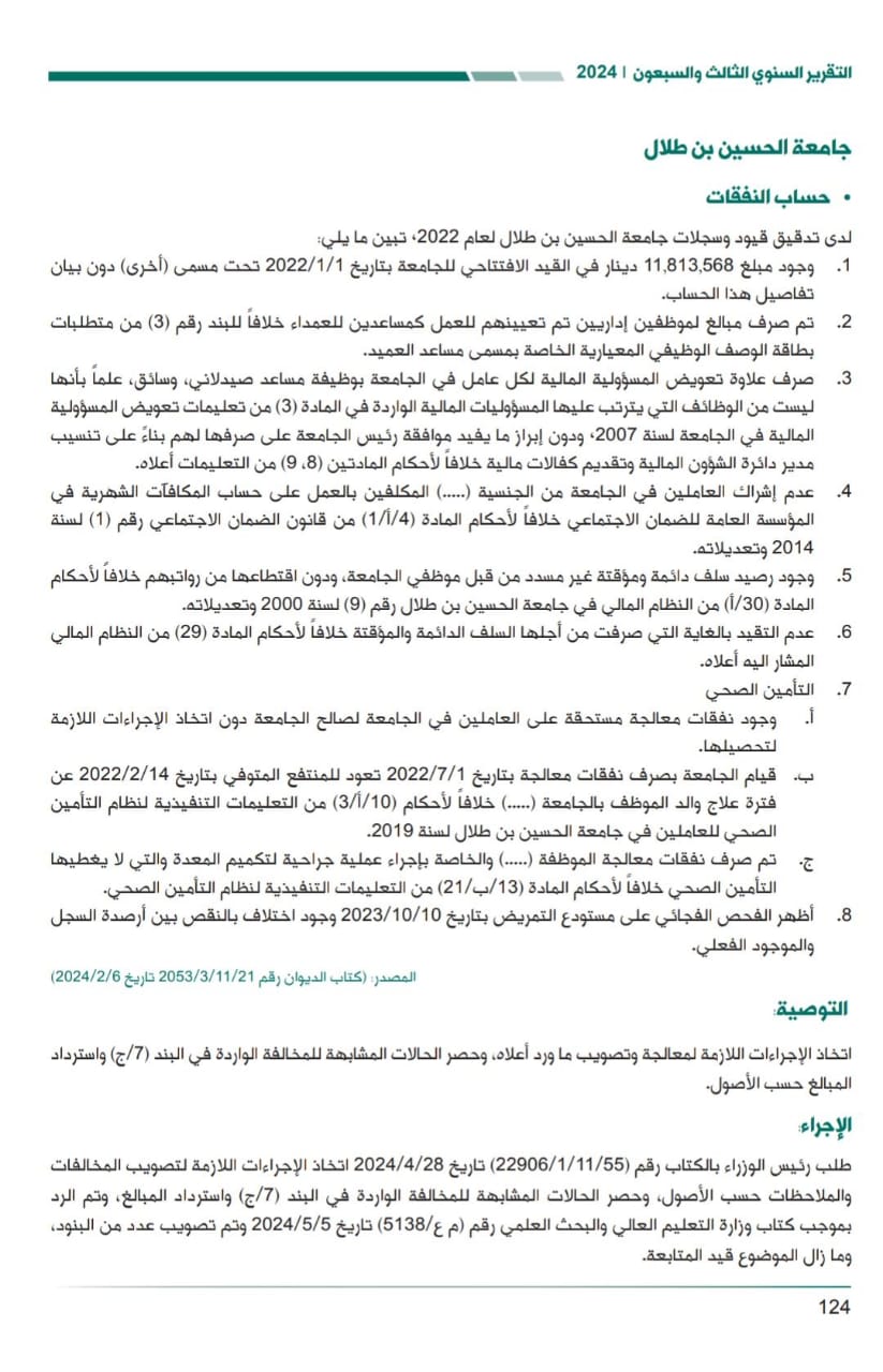 وفي جانب آخر، أشار التقرير إلى وجود دفعات دائمة ومؤقتة غير محددة السقف صُرفت لموظفين دون اقتطاعها أو تسويتها وفق الأصول، وبخلاف أحكام النظام المالي لجامعة الحسين بن طلال رقم (9) لسنة 2000 وتعديلاته، إضافة إلى عدم التقيد بأحكام صرف السلف المنصوص عليها في المادة (29) من النظام ذاته.