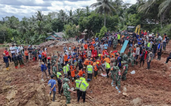 ووقعت الانهيارات الأرضية في قرية باسير لانجو بمنطقة باندونج بارات في وقت مبكر من صباح السبت الماضي، بعد أمطار غزيرة بدأت قبل ذلك بيوم.