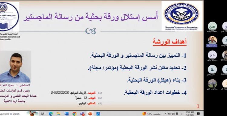 وكالة الناس – نظّمت جامعة إربد الأهلية، ممثلةً بعمادة البحث العلمي والدراسات العليا، ورشة تدريبية متخصصة بعنوان “أسس استخلاص ورقة بحثية من رسائل الماجستير”، وذلك عبر منصة Microsoft Teams، بمشاركة واسعة من طلبة الدراسات العليا.