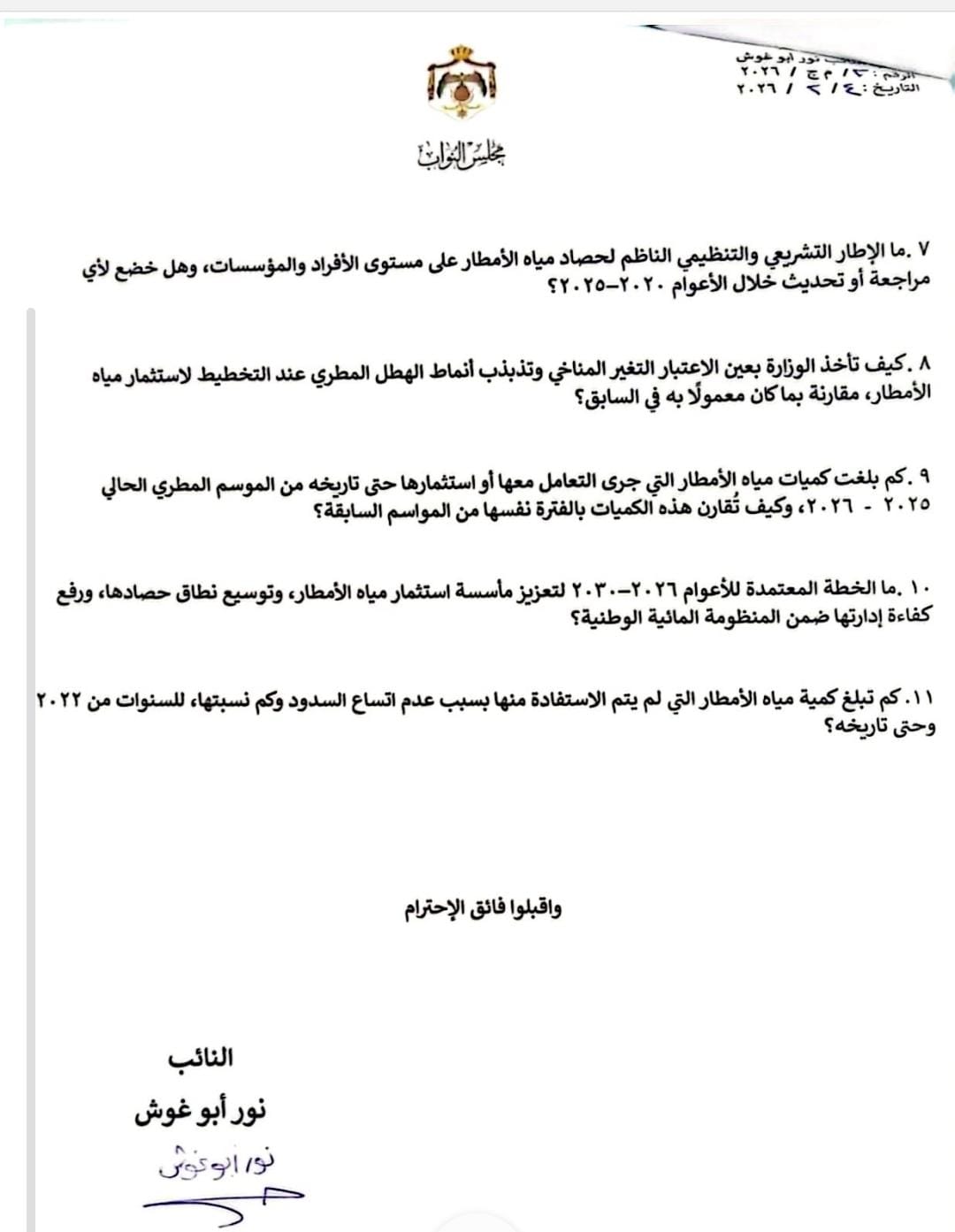 وطالبت أبو غوش بتوضيح كيفية إدراج مياه الأمطار ضمن الخطط المائية المعتمدة حتى عام 2030، وموقعها مقارنة بمصادر المياه الأخرى، إلى جانب تزويد المجلس بكميات الهطل المطري المسجلة في المملكة خلال الأعوام 2020–2025، وتوزيعها الجغرافي، ونسبة ما جرى استثماره منها فعليًا.