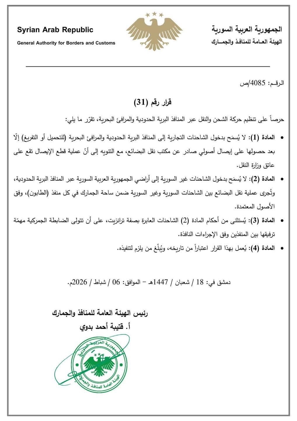 واستثنى القرار الشاحنات العابرة بصفة “ترانزيت” على أن تتولى الضابطة الجمركية مهمة ترفيقها بين المنفذين.