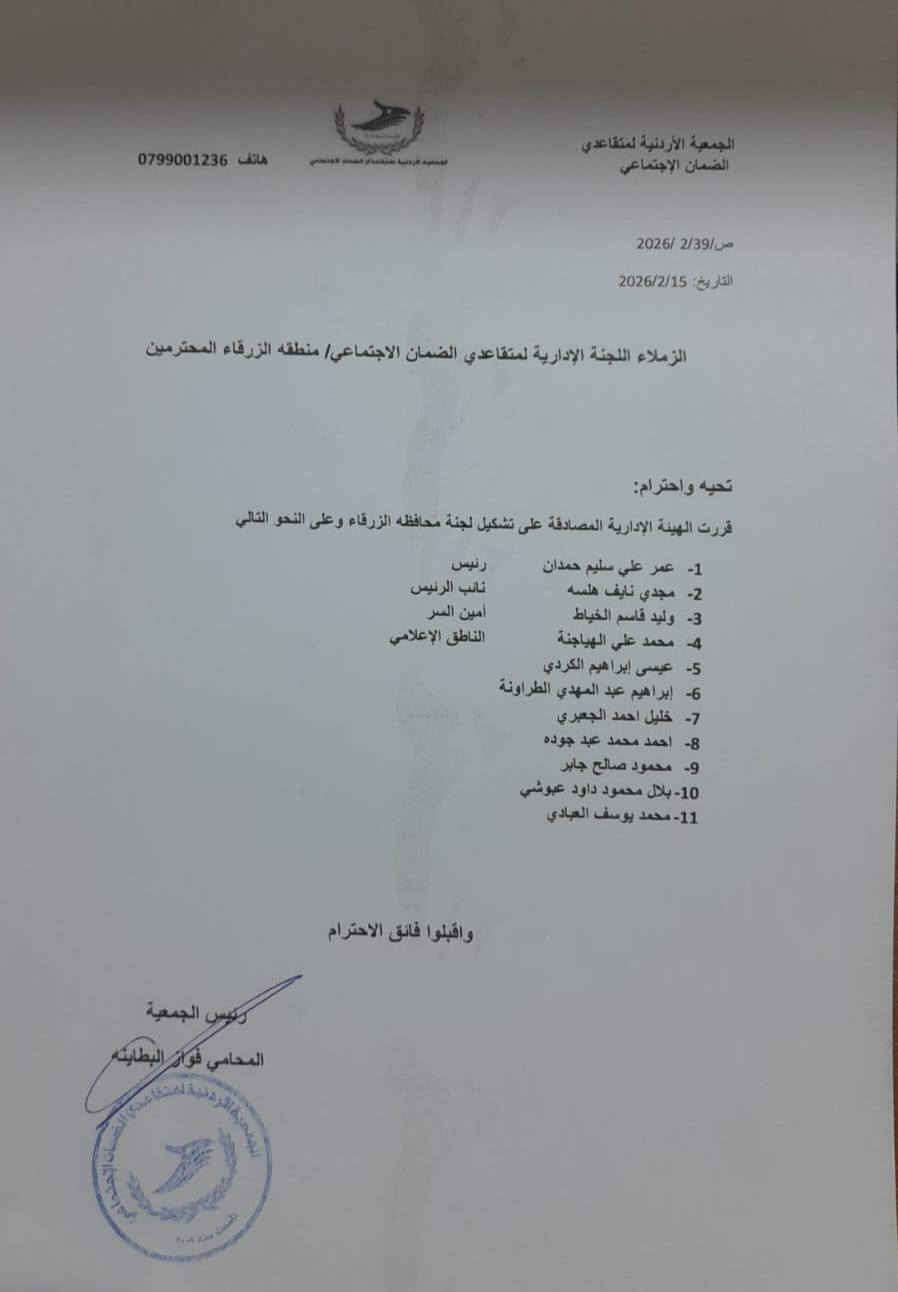 قرارات الهيئة الإدارية لجمعية متقاعدي الضمان الاجتماعي تشكيل لجنة متقاعدي الضمان الاجتماعي فرع الزرقاء…