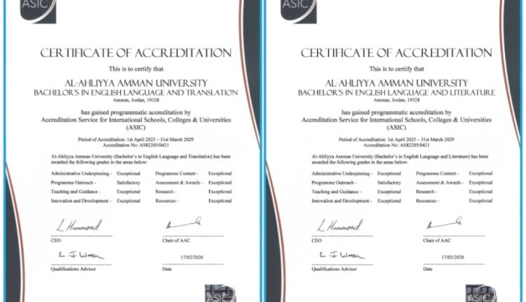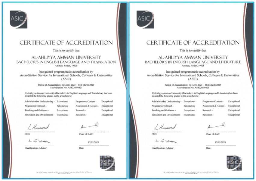 عمان الاهلية تحوز على الاعتماد البريطاني ASIC ببرنامجي اللغة الانجليزية “الآداب والترجمة ” وفق أعلى مستوى