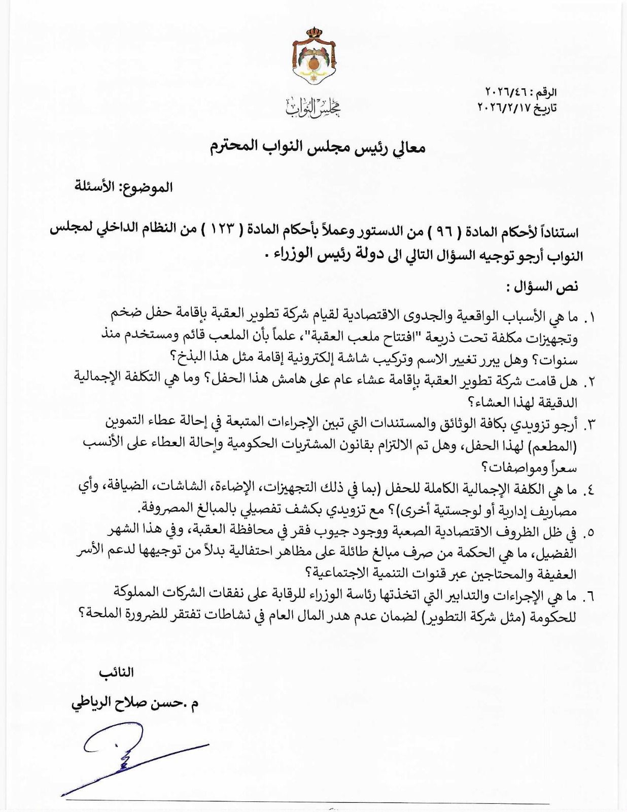 وجّه النائب حسن صلاح الرياطي، كتاباً رسمياً يحمل الرقم (46/2026) بتاريخ 17/2/2026 إلى معالي رئيس مجلس النواب الأردني، استناداً لأحكام المادة (96) من الدستور والمادة (123) من النظام الداخلي للمجلس، طالب فيه بتوجيه جملة من الأسئلة إلى دولة رئيس الوزراء حول ملابسات وكلفة حفل ما سُمّي بـ”افتتاح ملعب العقبة”.