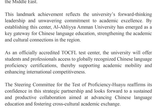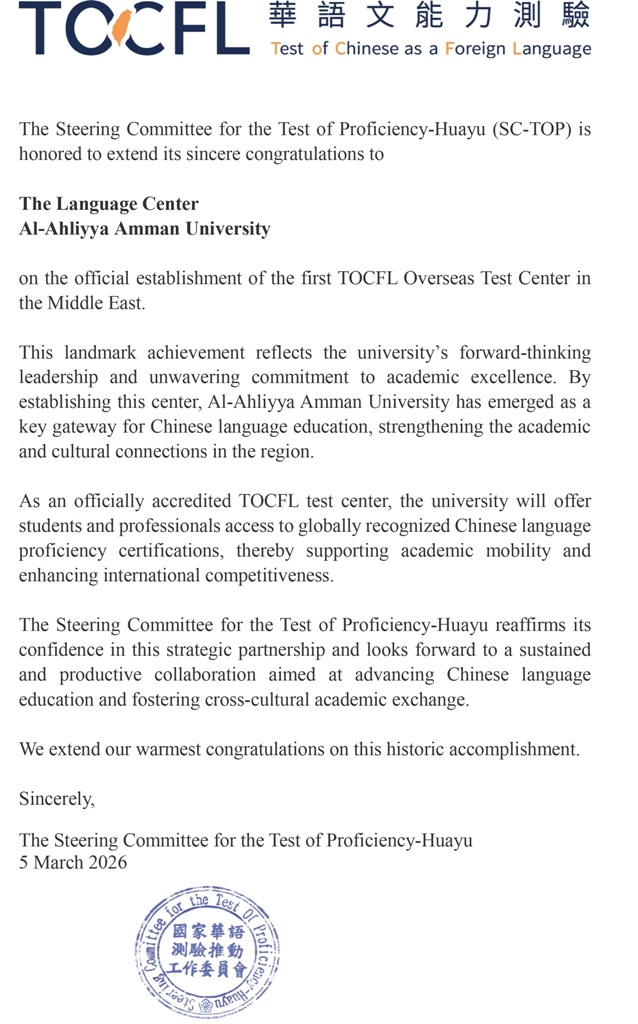 وكالة الناس -حققت جامعة عمّان الأهلية إنجازًا أكاديميًا جديدًا على مستوى المنطقة بعد اعتماد مركز اللغات في الجامعة رسميًا كمركز خارجي لتقديم اختبار الكفاءة في اللغة الصينية كلغة اجنبية (TOCFL – Test of Chinese as a Foreign Language)
