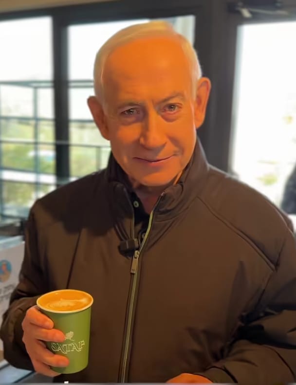 ونشر نتنياهو على حساباته في منصات التواصل شريط فيديو لنفسه في مقهى يحتسي القهوة.