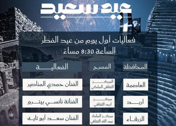 وفي الأمسيات الفنية التي ستقام مساء الساعة 8:30 من أيام عيد الفطر المبارك سيشارك في أول أيام العيد الفنانون؛ حمدي المناصير في المركز الثقافي الملكي بعمان، ونانسي بيترو في مركز اربد الثقافي، وسعد أبو تايه بمركز الملك عبدالله الثاني في الزرقاء، ورامي شفيق في قاعة بلدية مادبا.