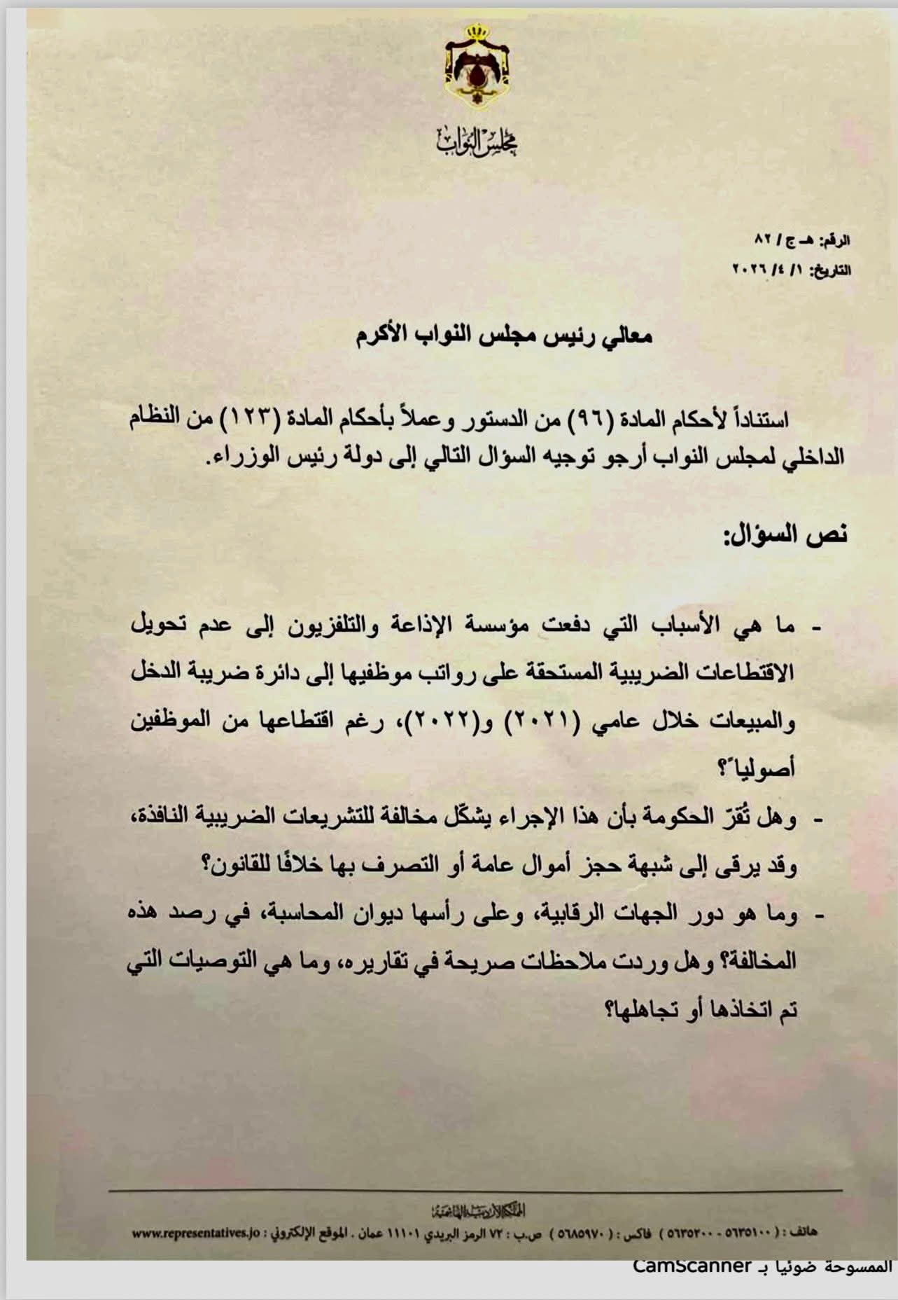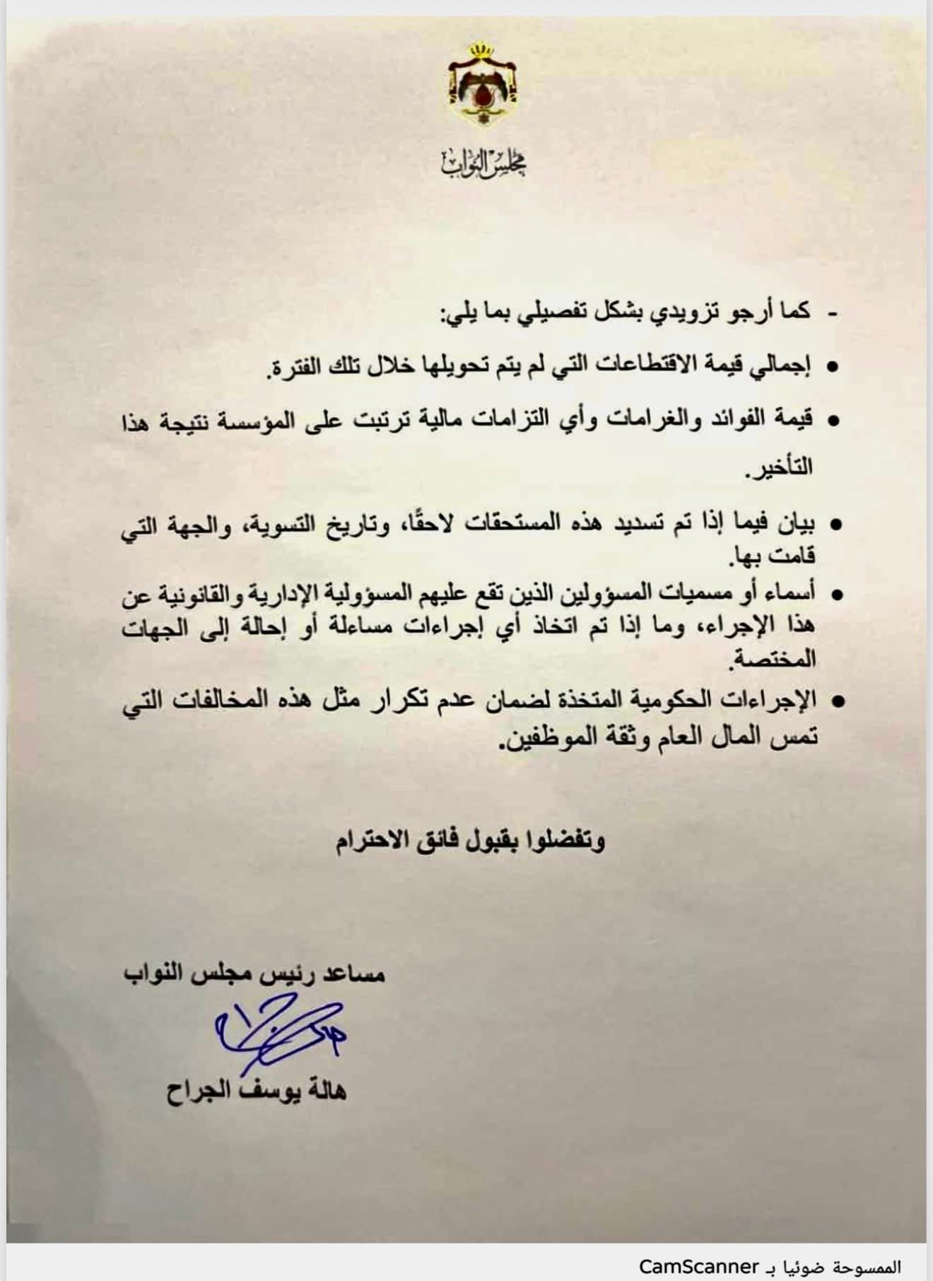 وتساءلت الجراح في كتابها الرسمي عن الأسباب التي دفعت المؤسسة لعدم تحويل هذه الاقتطاعات رغم حسمها من الرواتب، ومدى اعتراف الحكومة بأن هذا الإجراء يشكل مخالفة صريحة للتشريعات الضريبية النافذة.
