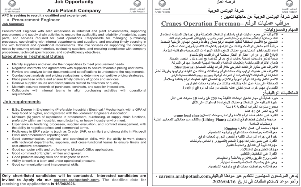 وظائف شاغرة لدى شركة البوتاس