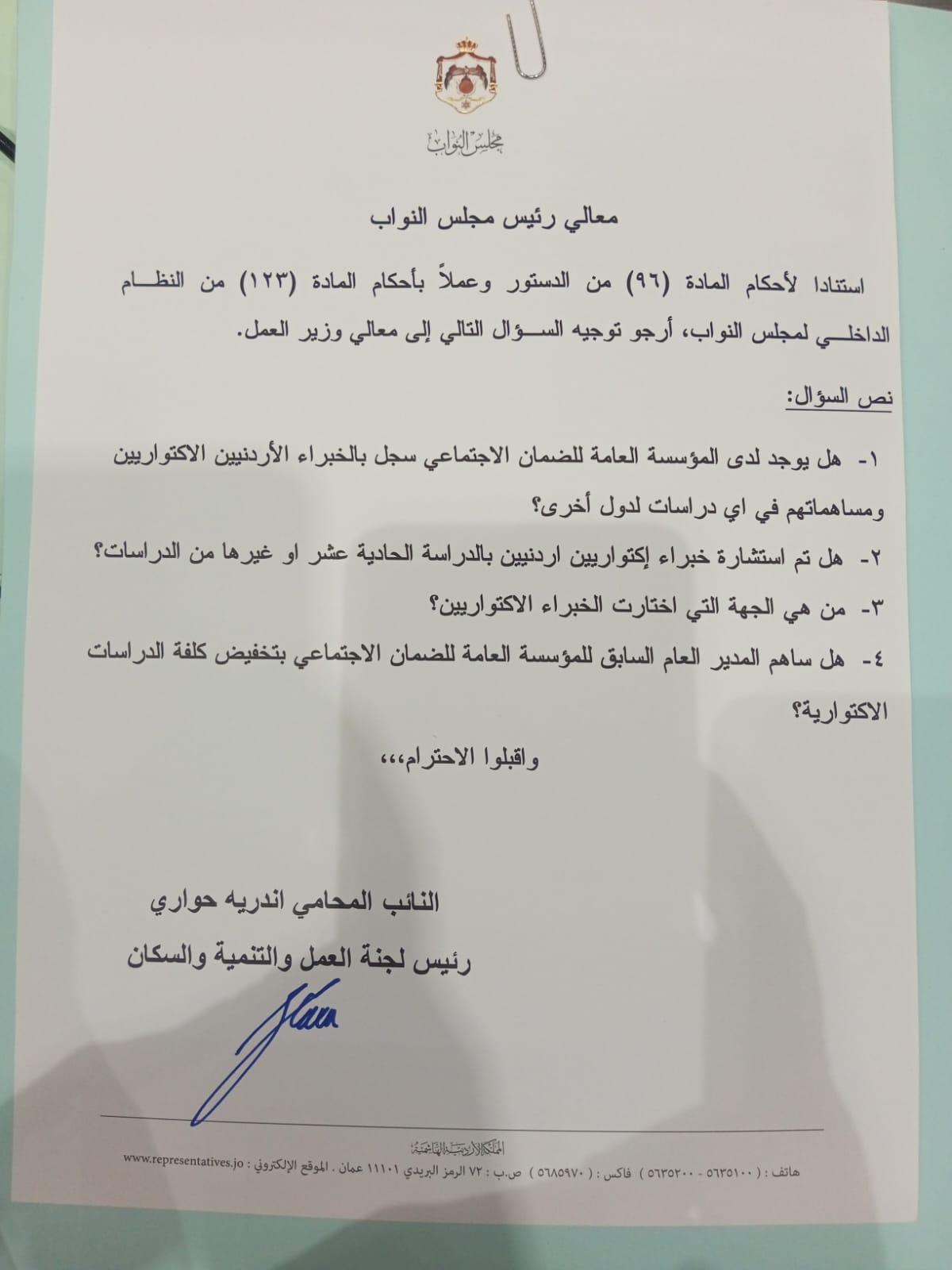 وتضمّن السؤال عدة محاور رئيسية، أبرزها الاستفسار عن وجود سجل لدى المؤسسة العامة للضمان الاجتماعي للخبراء الاكتواريين الأردنيين، ومدى مشاركتهم في إعداد دراسات محلية أو لدول أخرى، في إشارة إلى أهمية الاستفادة من الكفاءات الوطنية في هذا المجال.