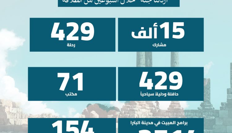 وكالة الناس -سجل برنامج “أردننا جنة” إقبالاً لافتاً منذ انطلاقه، حيث بلغ عدد المشاركين نحو 15 ألف مشارك خلال الأسبوعين الماضيين، توزعوا على 429 رحلة وحافلة، بمشاركة 429 دليلاً سياحياً، و71 مكتب سياحة وسفر، إلى جانب 35 مطعماً و42 فندقاً ومخيماً سياحياً.