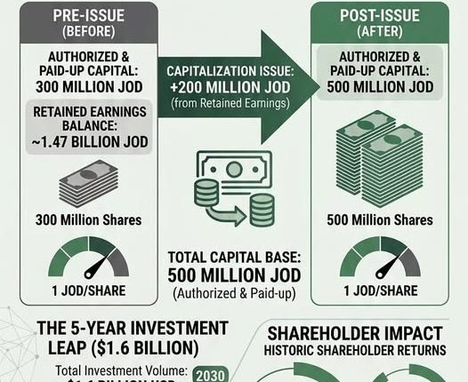 كما وافقت الهيئة بالإجماع على رفع رأس مال الشركة من 300 مليون دينار إلى 500 مليون دينار، في إطار تعزيز قدراتها التوسعية وتمويل مشاريعها المستقبلية.
