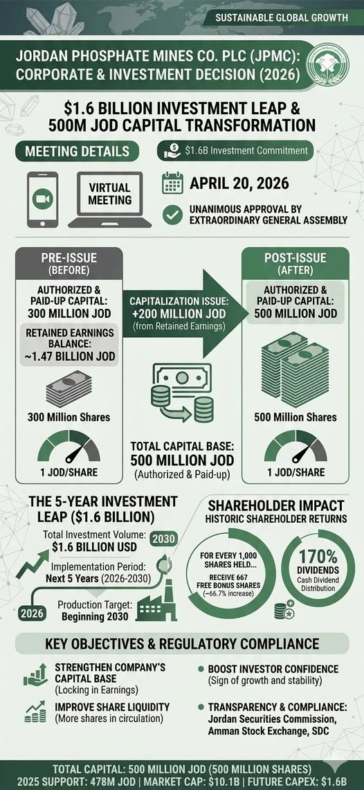 وكالة الناس – أعلنت شركة مناجم الفوسفات الأردنية عن حزمة قرارات وصفت بـ”التاريخية”، خلال اجتماع الهيئة العامة غير العادي لشهر نيسان 2026، في خطوة تعكس قوة الشركة وتوسّعها المتسارع على المستويين الإقليمي والعالمي.