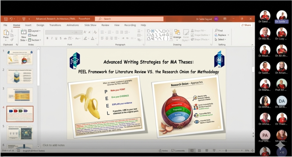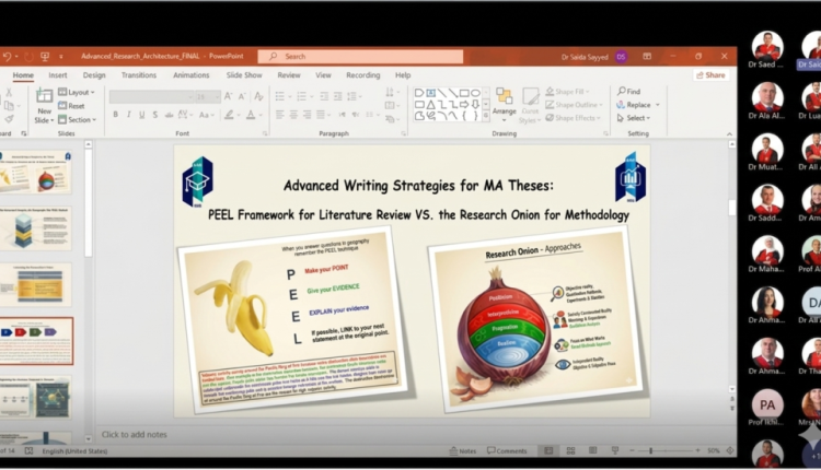 وكالة الناس -في إطار السعي المستمر لتطوير المهارات البحثية لدى طلبة الدراسات العليا، وبهدف تعزيز الممارسات الإشرافية في توعية الطلبة وتوجيههم نحو إتقان مهارات الكتابة الأكاديمية الرصينة وإعداد أطروحات علمية تتسم بالعمق المنهجي، نظمت كليتا الدراسات العليا والأعمال ورشة عمل علمية متخصصة بعنوان “استراتيجيات الكتابة المتقدمة في كتابة الرسائل الجامعية: إطار PEEL للأدبيات السابقة وبصلة البحث لمنهجية البحث العلمي”.