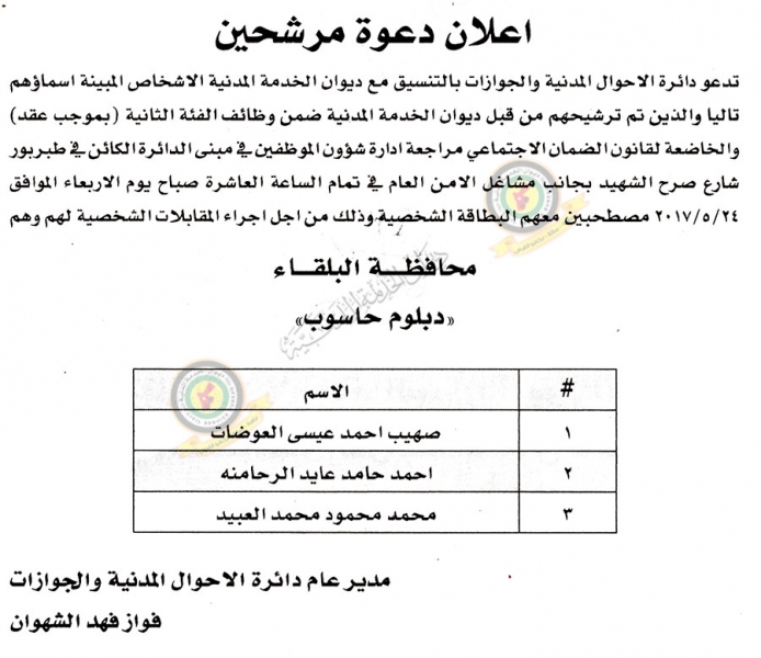 وكالة الناس – دعا ديوان الخدمة المدنية بالتعاون مع مختلف الوزارات والمؤسسات الحكومية، التالية اسماؤهم لاجراء المقابلات الشخصية وعقد الامتحان التنافسي لغايات التعيين.