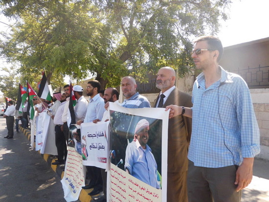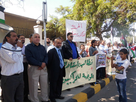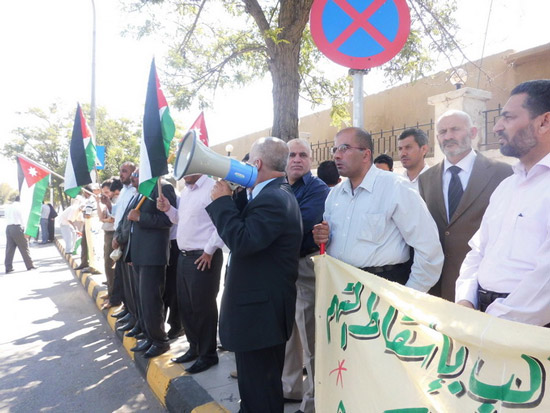 ورفع المعلمون لافتات كتب عليها “الحرية للمعلم هشام الحيصة”، “نقابة المعلمين الأردنيين تطالب بالإفراج الفوري عن المعلم هشام الحيصة”.