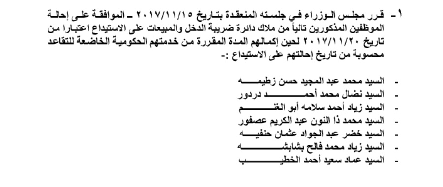 وكالة الناس – نشر عدد الجريدة الرسمية لليوم الاحد، قرارات مجلس الوزراء المتضمنة إحالة عدد من الموظفين في عدد من الوزارات والدوائر إلى التقاعد، اضافة الى ترفيع موظفين واستيداع اخرين.