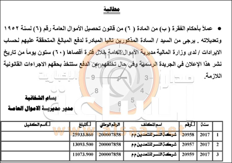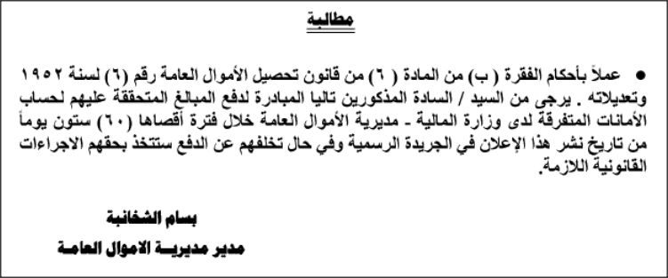 راجعوا «الأموال العامة» (أسماء) على هذة “الاسماء” مراجعة «الأموال العامة» Last updated ديسمبر 30, 2017 Share وكالة الناس – دعت مديرية الأموال العامة – وزارة المالية التالية أسماؤهم إلى مراجعتها بعد نشر هذا الاعلان في الجريدة الرسمية. وتاليا الأسماء: