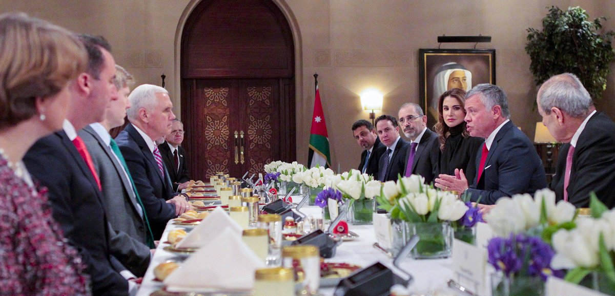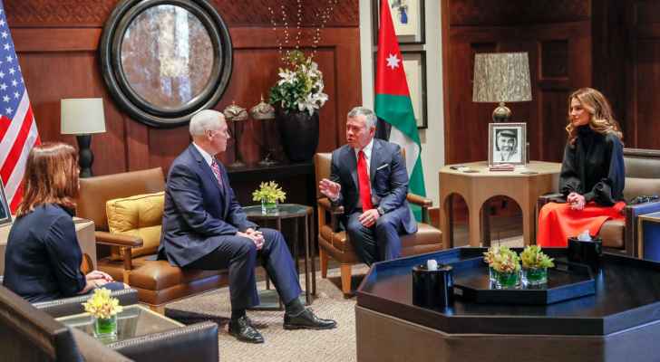 وكالة الناس – التقى جلالة الملك عبدالله الثاني، الاحد، بحضور جلالة الملكة رانيا العبدالله، نائب الرئيس الأمريكي مايك بنس والسيدة عقيلته في قصر الحسينية.