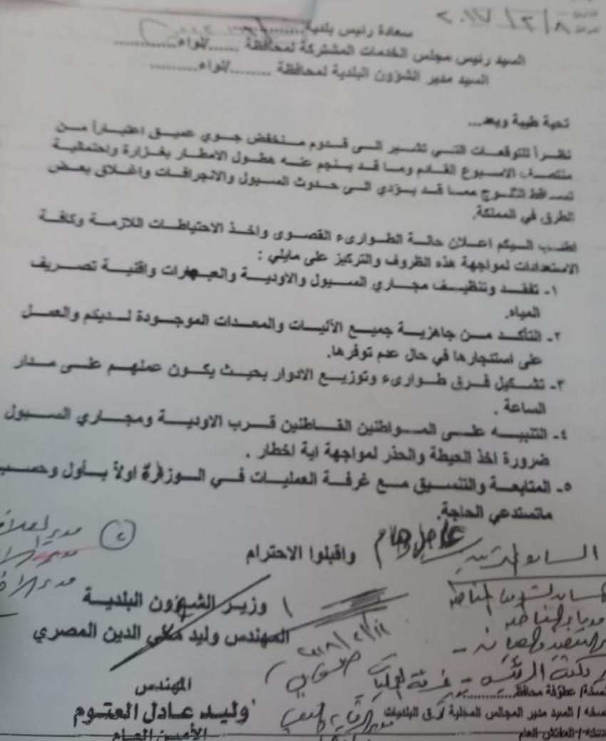 ووجه المصري كتابا الى رؤساء البلديات ومجالس الخدمات المشتركة ومدراء الشؤون البلدية في المحافظات للتركيز على تفقد وتنظيف مجاري السيول والاودية والعبارات واقنية تصريف المياه والتأكد من جاهزية جميع الآليات والمعدات وتشكيل فرق الطوارئ بحيث يكون عملهم على مدار الساعة والتنبيه على المواطنين القاطنين قرب الاودية ومجاري السيول ضرورة اخذ الحيطة والحذر لمواجهة اية اخطار بالإضافة الى المتابعة والتنسيق مع غرفة العمليات في الوزارة اولا بأول وحسب ما تستدعي الحاجة.