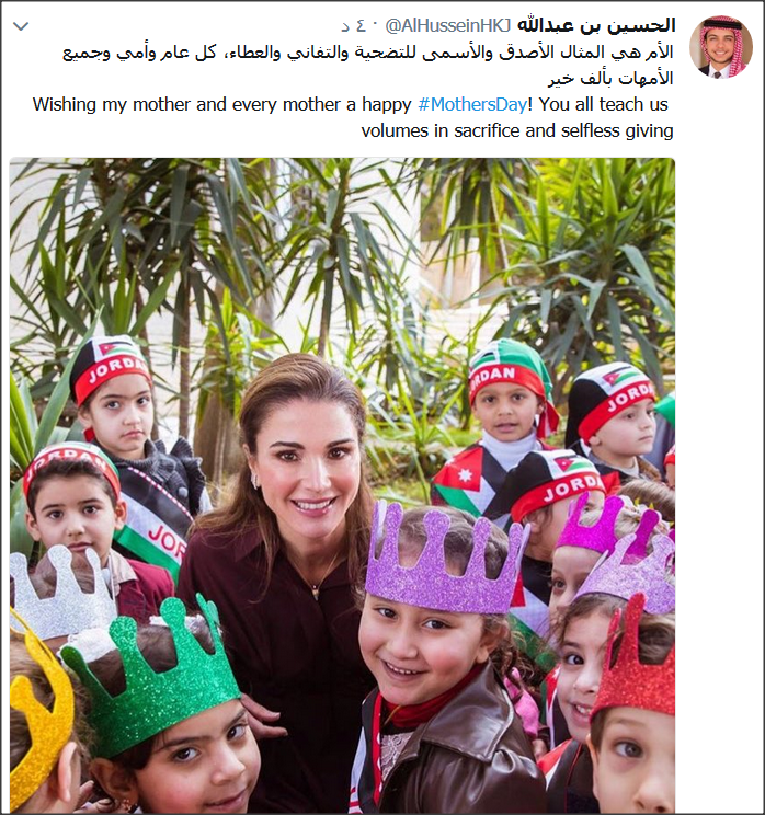 ولي العهد: الأم هي المثال الأصدق والأسمى للتضحية والتفاني والعطاء On مارس 21, 2018 Share وكالة الناس – هنأ ولي العهد، سمو الامير الحسين بن عبدالله الثاني، بعيد الام، الذي يصادف اليوم الاربعاء. وقال سموه في تغريدة على تويتر “الأم هي المثال الأصدق والأسمى للتضحية والتفاني والعطاء، كل عام وأمي وجميع الأمهات بألف خير”.الدستور