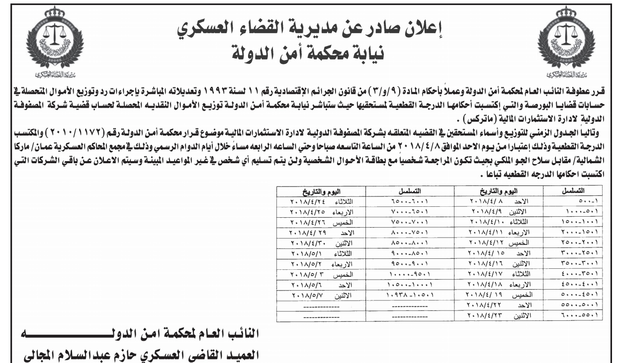 أسماء مستحقي الأموال النقدية المحصلة من شركة المصفوفة ‘ماتركس’ Last updated أبريل 11, 2018 Share وكالة الناس – تاليا أسماء مستحقي الأموال النقدية المحصلة من شركة المصفوفة ‘ماتركس’ :