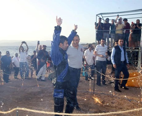 من جهته؛ قال الغطاس الكابتن النصرات ان الوقت الذي امضاه داخل البحر لم يكن بالسهل لانعدام الجاذبية، مؤكداً على مواصلة مشواره ورفع علم الاردن في كافة المحافل العربية والعالمية من خلال تحطيم الرقم القياسي العالمي الى جانب المساهمة في تسليط الضور على مدينة العقبة ولفت الانتباه الى رياضة الغوص.