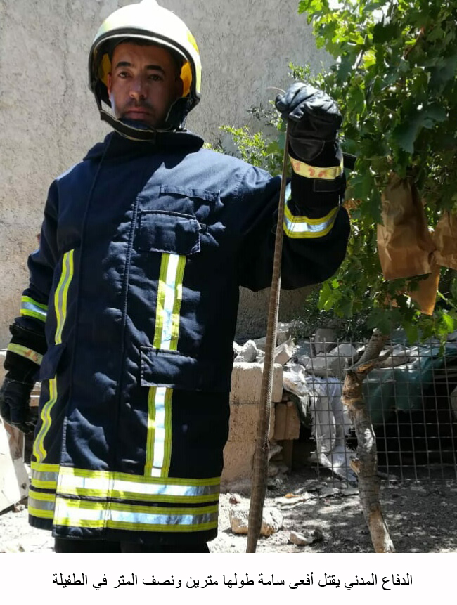 وكالة الناس – تمكنت كوادر إنقاذ مديرية دفاع مدني الطفيلة من قتل أفعى سامة يبلغ طولها مترين ونصف المتر داخل إحدى المنازل في منطقة بصيرا بمحافظة الطفيلة.