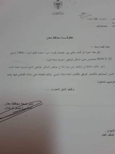إذ أكدت تقارير فنية من قبل الجهات المعنية من خلال الكتب الرسمية بضرورة إخلاء تلك البناية وذلك حفاظا على سلامة القاطنين فيها ، ولكن ولغاية الآن لم يتم التعامل مع هذه التقارير ومخرجاتها من الكتب الرسمية التي وصلت الحكومة المحلية في محافظة معان والتي ما زالت تقبع هذه الكتب في ادراجها دون اتخاذ أي إجراءات استباقية تحول لا سمح الله دون وقوع ضحايا او وفيات كما حدث في محافظة الزرقاء في حي الغويرية. الدستور