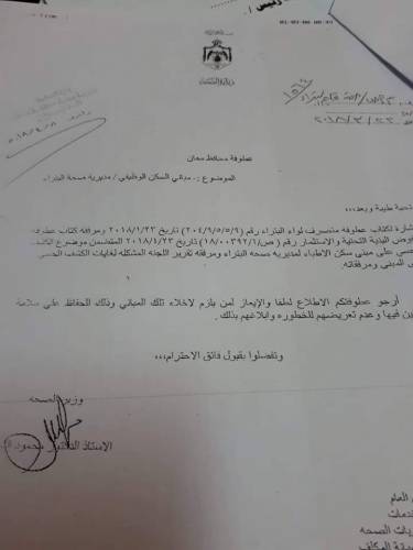 وأضاف أن الوزارة أعلنت عن استئجار مبنى كسكن بديل لهذا السكن لتوفير الراحة النفسية وإزالة شبح الخطورة عن كوادرها الطبية العاملة في مستشفى الملكة رانيا إلا انه لم يتم التقدم من قبل المجتمعات المحلية لغاية الآن .