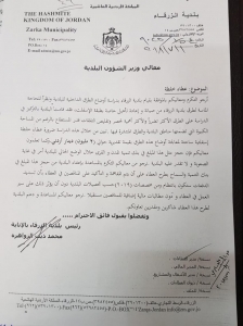 واظهر كتاب رسمي صادر عن بلدية الزرقاء وموجه الى وزير الشؤون البلدية تعهد البلدية على التفاهم والتأكيد على المناقصين في عطاء الخلطة الاسفلتية بتسديد قيمة العطاء على دفعات منتظمة ومن موازنة البلدية وحسب التحصيلات المالية ودون مطالبات مالية اضافية مستقبلا.