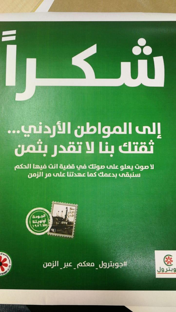 وكالة الناس – تتقدم شركة مصفاة البترول الاردنية بعظيم الشكر للمواطن الاردني على ثقته الغالية والكبيرة في منتجات الشركة، اذ ان هذه الثقة لا تقدر بثمن.