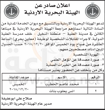 وكالة الناس – دعت البحرية الاردنية التالية اسماؤهم لاجراء مقابلات شخصية لوظيفة معاين.