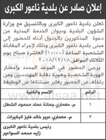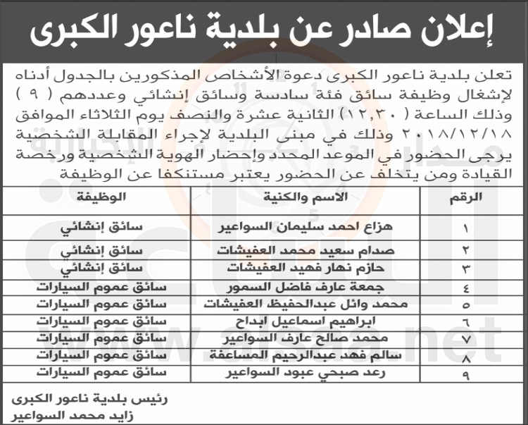 كما دعت بلدية ناعور التالية اسماؤهم لمقابلات.