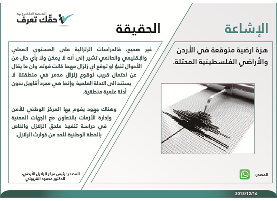 غير صحيح، فالدراسات الزلزالية على المستوى المحلي والإقليميم والعالمي تشير أنه لايمكن ولا بأي حالٍ من الأحوال تنبؤ أو توقع زلزال مدمر في منطقتنا.’