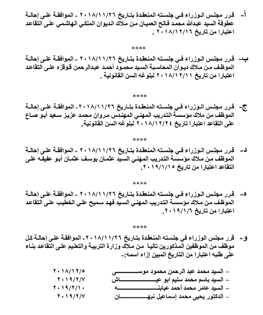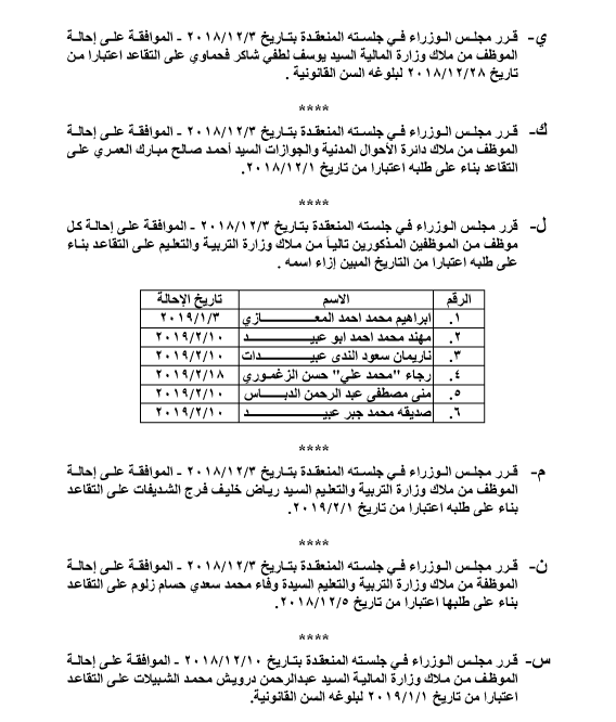 وكالة الناس – وافق مجلس الوزراء على إحالة موظفين في وزارة التربية ومختلف الوزارات والمؤسسات الحكومية على التقاعد، اعتبارا من التاريخ المبين إزاء اسم كلّ منهم.