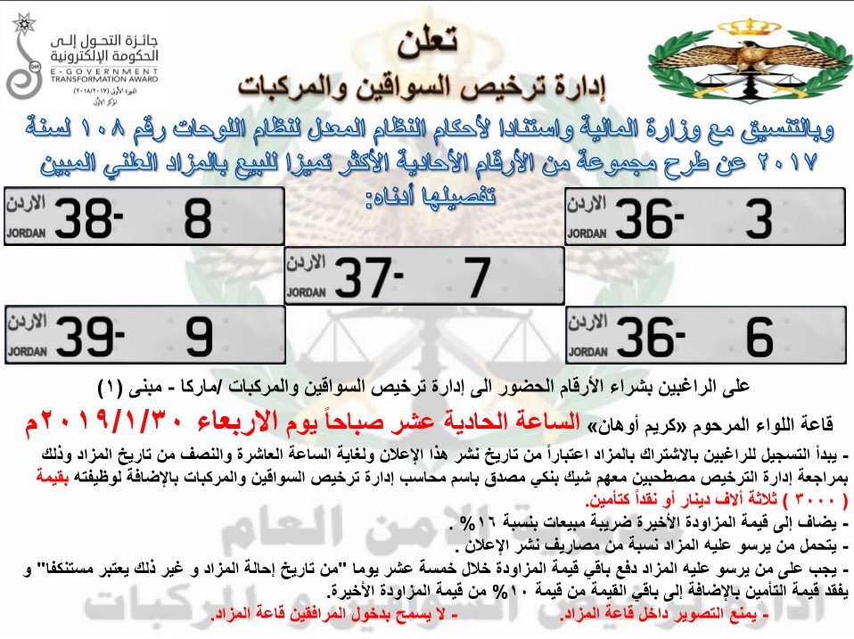 وكالة الناس – طرحت إدارة ترخيص السواقين والمركبات بالتنسيق مع وزارة المالية، اليوم الأحد، أرقام مركبات أحادية مميزة للبيع في مزاد علني.