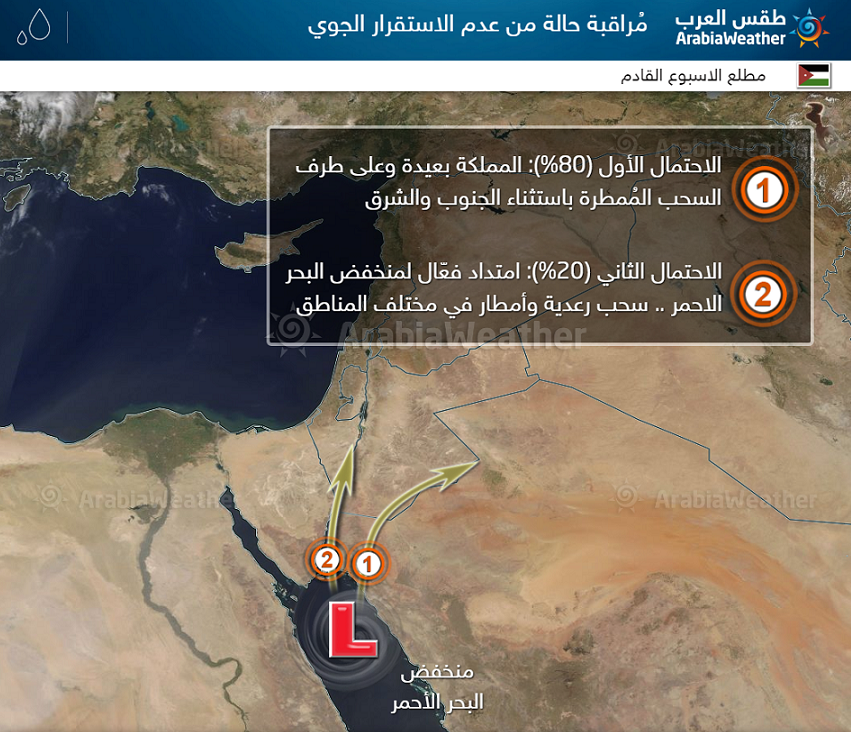 الاحتمال الثاني 20%: وهو احتمال منخفض للغاية وضعيف التحقق بعد مشيئة الله، وهو استجابة فعالة لمنخفض البحر الأحمر واندفاعه شمالا ليشمل أجزاء واسعة من المملكة وفلسطين، لتشمل السحب الرعدية والأمطار معظم المناطق والمدن الرئيسية بحدة متفاوتة.