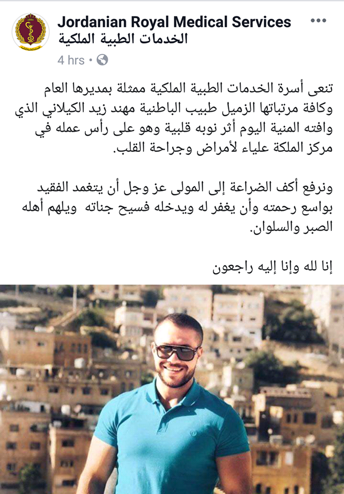 وكالة الناس – نعت أسرة الخدمات الطبية الملكية ممثلة بمديرها العام وكافة مرتباتها الزميل طبيب الباطنية مهند زيد الكيلاني الذي وافته المنية اليوم أثر نوبه قلبية وهو على رأس عمله في مركز الملكة علياء لأمراض وجراحة القلب.