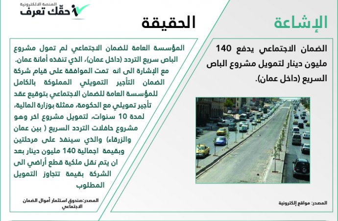 وأوضح الصندوق عبر المنصة أن المؤسسة العامة للضمان الاجتماعي لم تمول مشروع الباص سريع التردد (داخل عمان)، الذي تنفذه أمانة عمان.