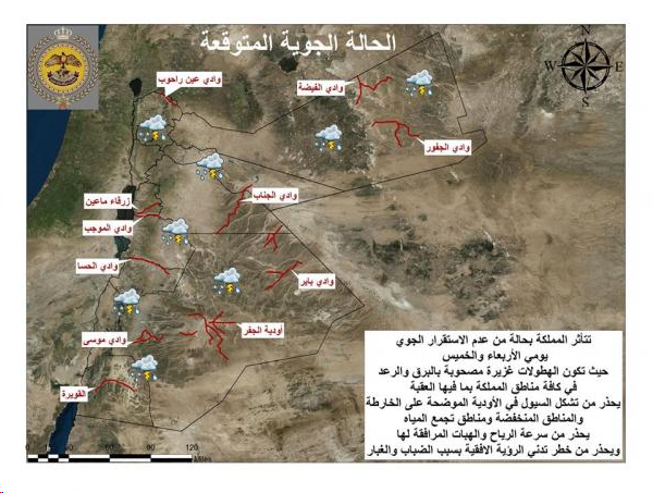 وتظهر الخارطة تمركز الخطر في 11 منطقة بالمملكة، وقالت إدارة الازمات إن هطولات غزيرة للامطار مصحوبة بالبرق والرعد في كافة مناطق المملكة بما فيها العقبة، كما وحذرت من تشكل السيول في الاودية والمناطق المنخفضة واماكن تجمع المياه.