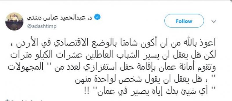 وقال في تغريدة على تويتر: اعوذ بالله من ان أكون شامتا بالوضع الاقتصادي في الاْردن ، لكن هل يعقل ان يسير الشباب العاطلون عشرات الكيلو مترات وتقوم أمانة عمان بإقامة حفل استفزازي لعدد من ‘المجهولات”، هل يعقل ان يقول شخص لواحدة منهن ‘اَي شيئ بدك إياه يصير في عمان’ !!