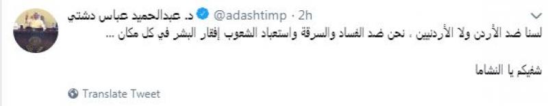 وأضاف في تغريدة ثانية: لسنا ضد الاْردن ولا الأردنيين، نحن ضد الفساد والسرقة واستعباد الشعوب إفقار البشر في كل مكان … شفيكم يا النشاما.