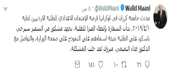 وأضاف في تغريدة على تويتر أنّ السفارة بدأت بإعطاء الفيزا للطلبة، بجهد مشكور من السفير سيرجي باسكو ، داعيًا من الطلبة تعبئة أسماءهم على النموذج على صفحة الوزارة، والتواصل مع الدكتور فداء التميمي .
