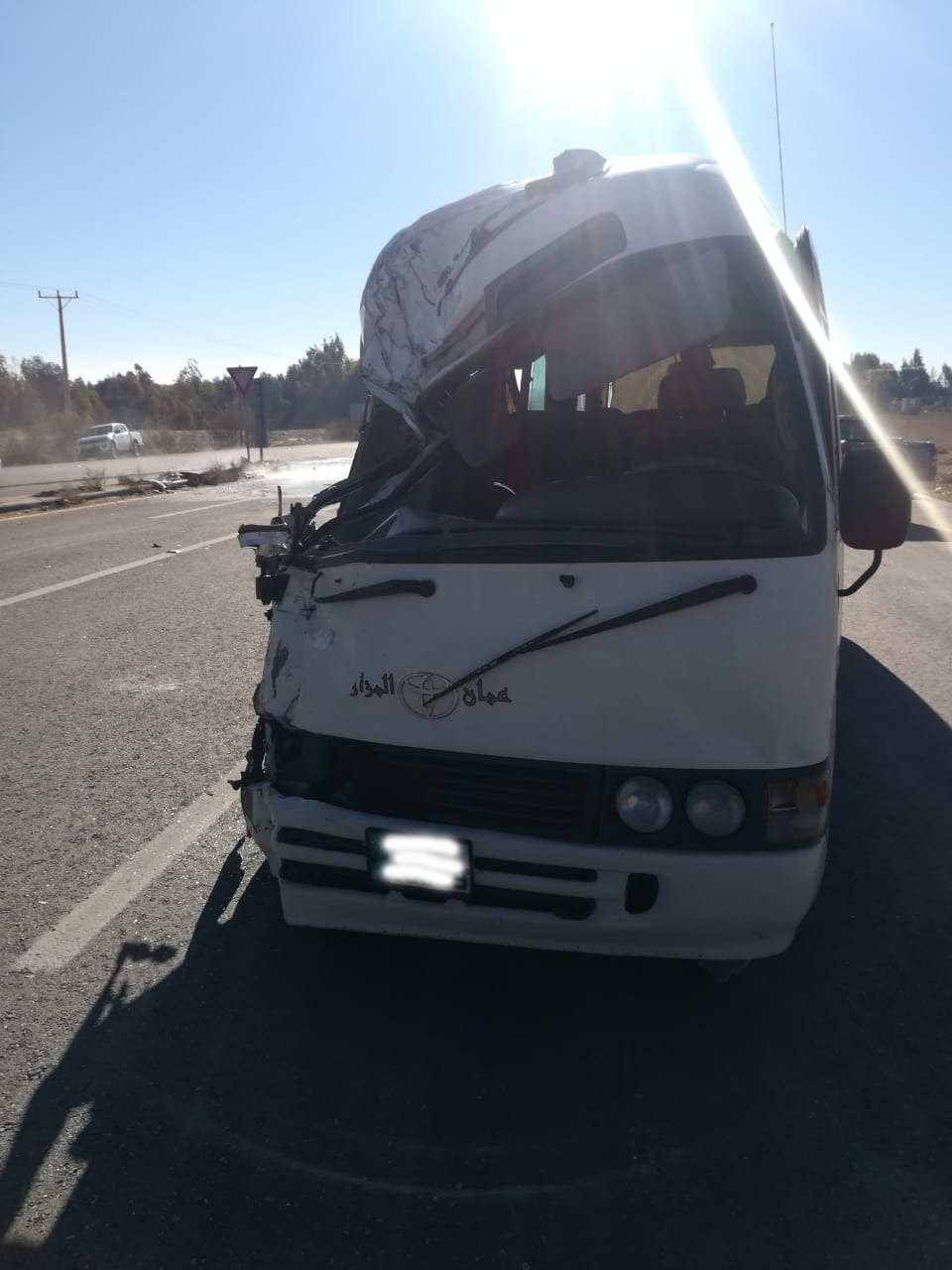 وكالة الناس – ذكرت إدارة الإعلام في الدفاع المدني أن كوادر الإنقاذ والإسعاف في مديرية دفاع مدني الكرك تعاملت صباح اليوم مع حادث تصادم وقع ما بين حافلة نقل عمومي تعمل على خط ( المزار – عمان ) و تريلا في منطقة القطرانة , حيث نتج عن الحادث إصابة ( 15 ) شخص بجروح و رضوض في مختلف أنحاء الجسم .