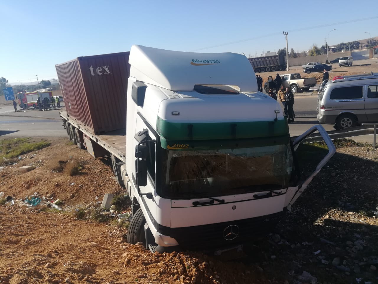 15 اصابة بتصادم حافلة وشاحنة على الطريق الصحراوي (صور)