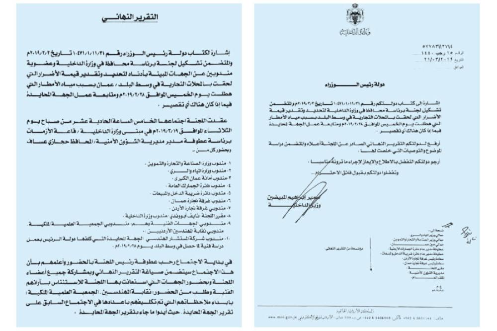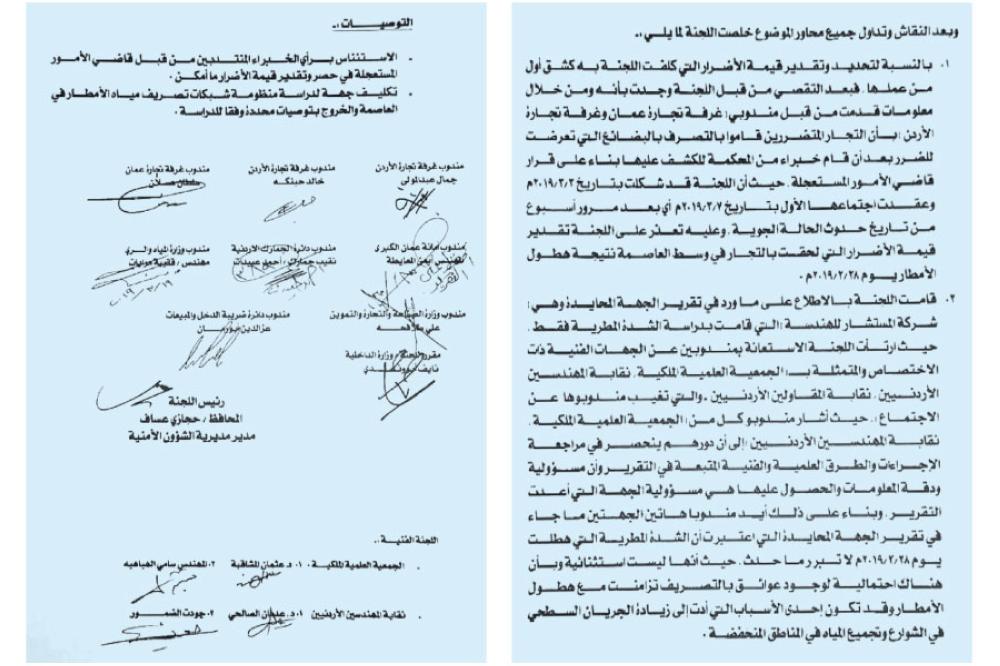 وتشكلت اللجنة الفنية برئاسة محافظ من وزارة الداخلية، ومندوبين عن جهات حكومية وفنية وشركة المستشار الهندسي (الجهة المحايدة)، لتحديد وتقدير قيمة الاضرار التي لحقت بالمحلات التجارية في وسط البلد بسبب مياه الامطار يوم الخميس الموافق 28/2/2019، ومتابعة عمل الجهة المحايدة فيما إذا كان هناك تقصير.