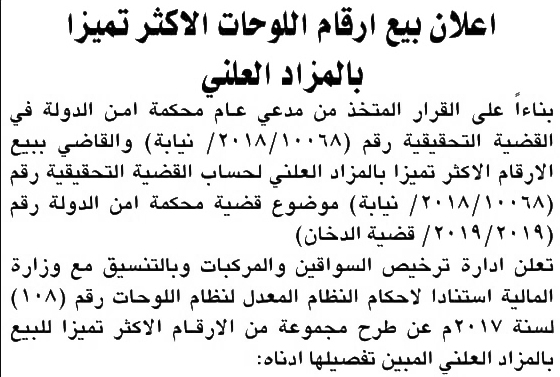 وقرر مدعي عام محكمة أمن الدولة الخاص بقضية الدخان بيع الأرقام المميزة للمتهمين و الاكثر تمييزا بالمزاد العلني لصالح القضية التحقيقية.