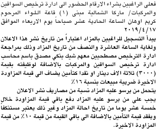 وكالة الناس – أعلنت إدارة ترخيص السواقين والمركبات بالتنسيق مع وزارة المالية عن طرح أرقام المركبات المميزة لمتهمي قضية الدخان بالمزاد العلني.
