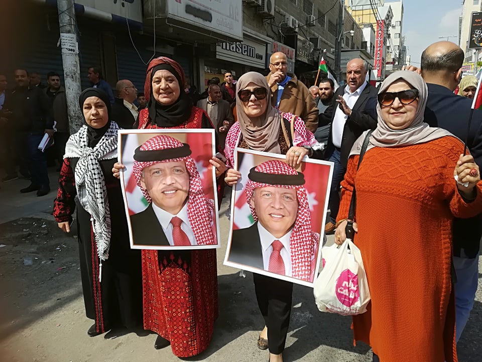 و رفع المشاركين بالمسيرة الاعلام الأردنية و يافطات أكدت على الوحدة الوطنية و الوقوف خلف القيادة الهاشمية، مرددين هتافات تشدد على قوة اللحمة الوطنية في كافة مكونات المجتمع الاردني؛ و أن القدس خط أحمر و التأكد على مواصلة العهد و البيعة للقيادة الهاشمية و الدفاع عن ثوابت الوطن و مقدارته و التفافهم حول الراية الهاشمية التي جعلت الاردن واحة أمن و إستقرار.![]()
